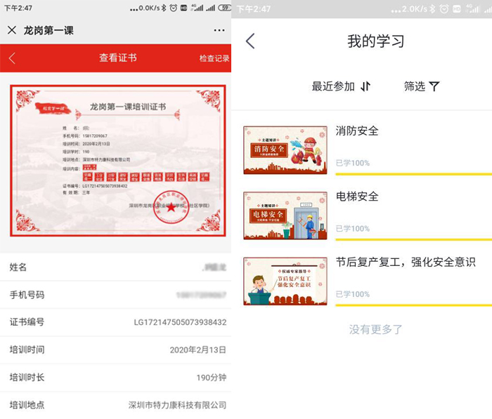 另外,防控期間為確保復(fù)工安全,我司全員進(jìn)行了“龍崗第一課學(xué)習(xí)平臺”的培訓(xùn)及“強(qiáng)安APP”的《節(jié)后復(fù)產(chǎn)復(fù)工,強(qiáng)化安全意識》的學(xué)習(xí)、考試、考證。
